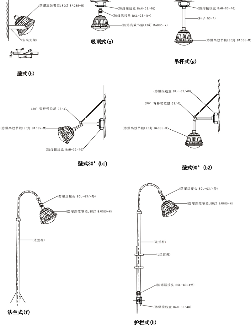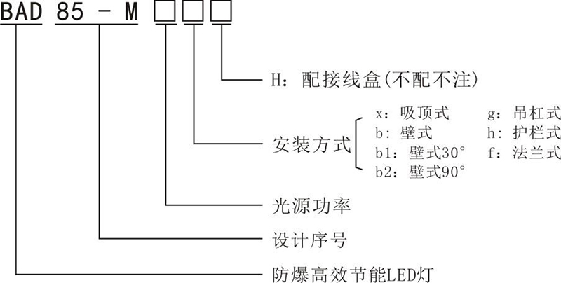 > 按照產(chǎn)品型號規(guī)格說明逐條選擇并注明防爆標(biāo)志,例如:需要防爆高效節(jié)能 LED 燈 100W 規(guī)格,吸頂式安裝,則產(chǎn)品型號為 BAD85-M100x ExdembⅡCT5 Gb。