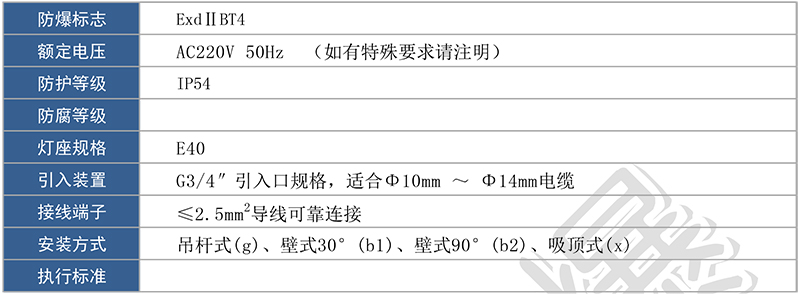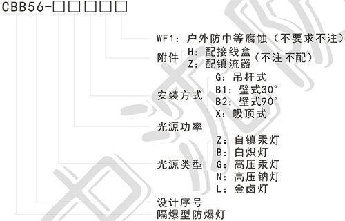 >?按照產品型號規格說明逐條選擇并注明防爆標志,例如:需要金鹵燈 175W,吸頂式安裝則產品選型為:CBB53-L175X ExdⅡBT4;