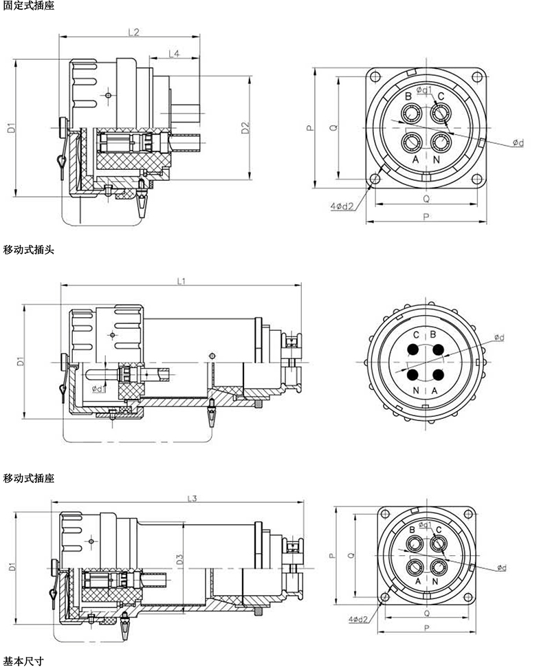 > 該電連接器有插頭和插座兩部分組成,其中插頭為移動式(YT),插座有 3 種形式選擇:①面板固定式(GZ)、②移動式(YZ)和③斜式固定插座(XGZ)。