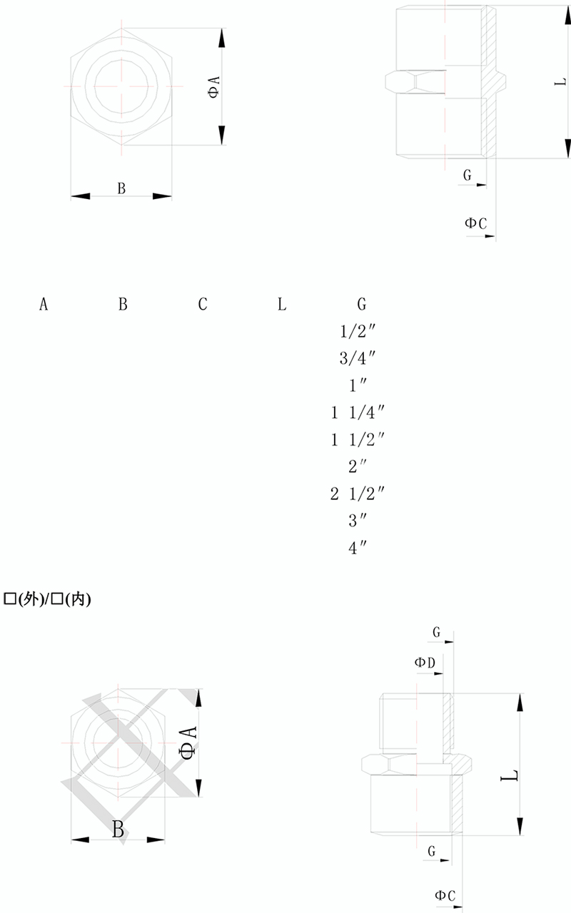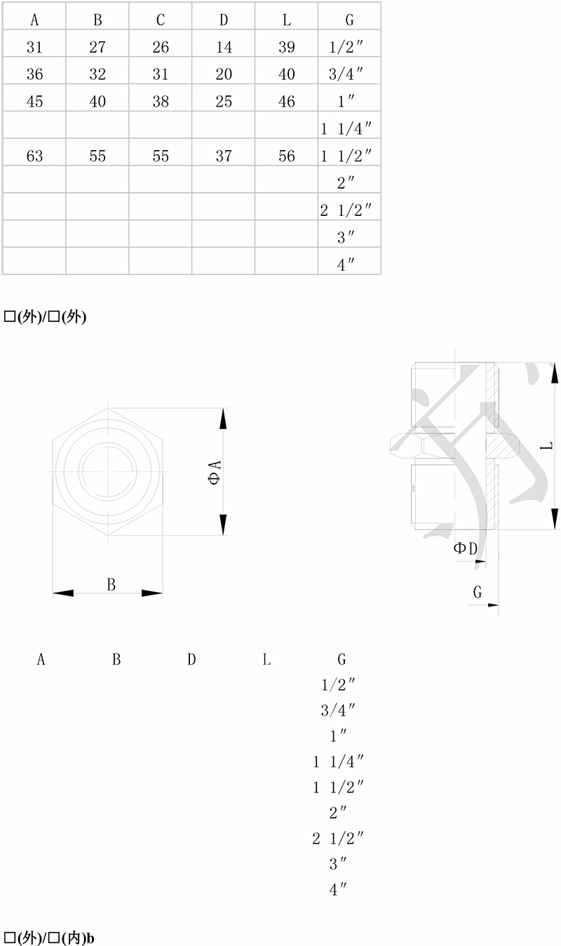> 按照產品型號逐條選擇并注明防爆標志,例如:需要一內一外 G3/4″螺紋防爆管接頭,則產品型號為 BGJ-G3/4″(外)/G3/4″(內) ExdⅡC Gb;需要內 G3/4″外 G1 1/4″螺紋防爆管接頭,則產品型號為 BGJ-G3/4″(外)/ G1 1/4″(內)b ExdⅡC Gb。