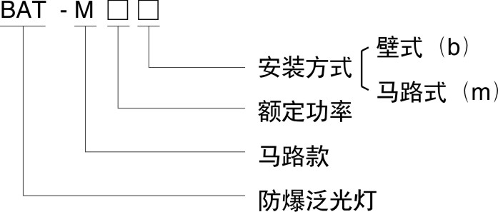> 按照產品型號規格說明逐條選擇并注明防爆標志,例如:需要LED防爆泛光燈100W 規格,馬路式安裝,則產品型號為 BAT-M100m ExdeⅡCT3 Gb。